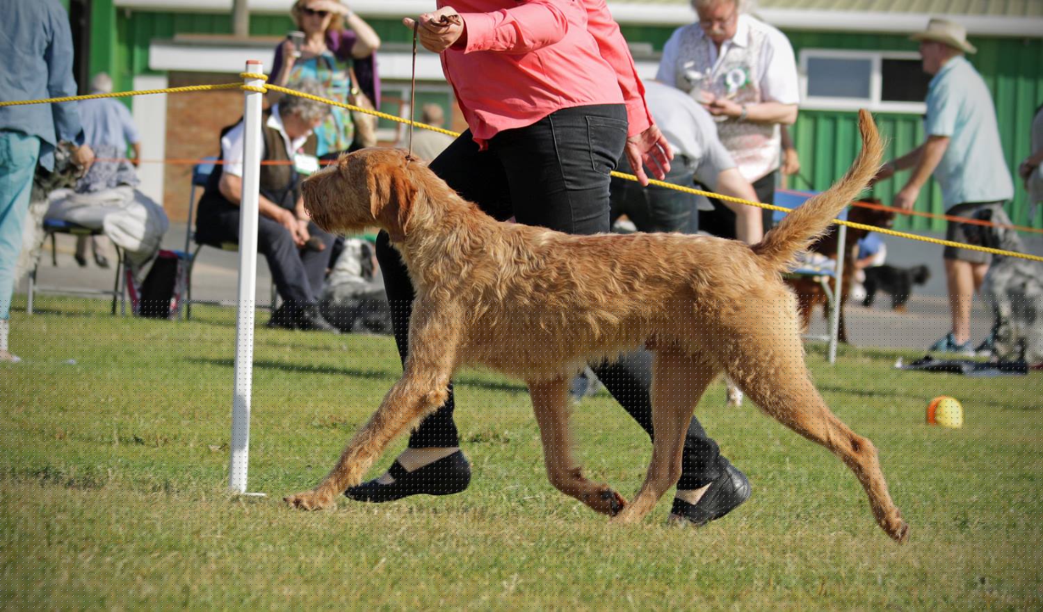 Parry & Newman’s Csovarberki Ravasz Amid Leiborschy (Imp Hun). This 13 mth old has an exquisite head with its moderately broad and slightly rounded skull, well placed ears and moderate stop. The colour of his eyes harmonises with his golden sand coat, his eyebrows are dense and his whole body is covered with a harsh and dry wire coat. I love his size, balance and well proportioned body which is slightly longer than its height. His movement is animated and ground covering and, although clearly immature, when it came to the challenge his forward reach and drive took him to the Res. CC. He is a very exciting prospect for the future and maturity will come.